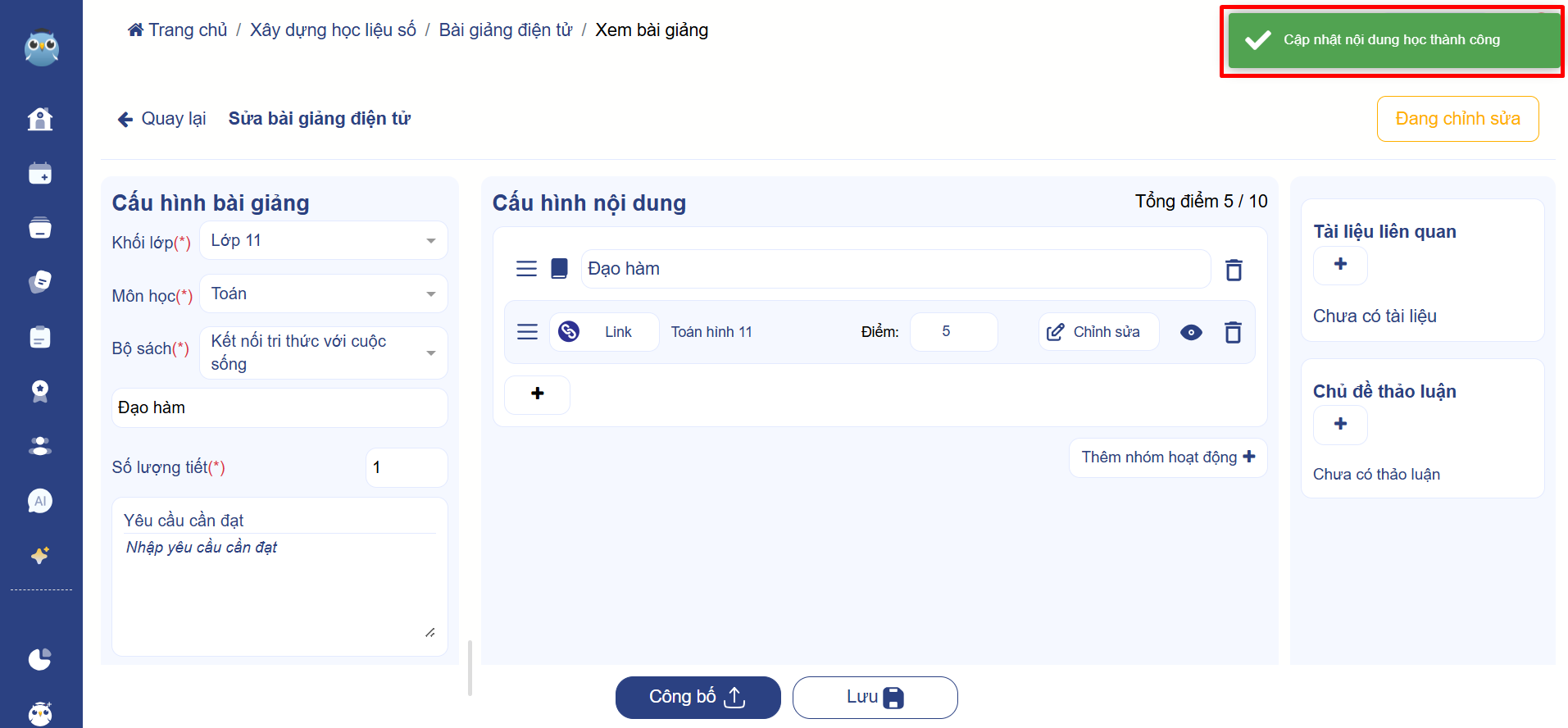 - Hệ thống hiển thị tạo bài giảng thành công.