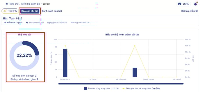 - Tại mục "báo cáo chi tiết", thầy cô sẽ thấy vòng tròn thể hiện tỷ lệ học sinh đã nộp bài, số học sinh đã nộp và tổng số học sinh được giao