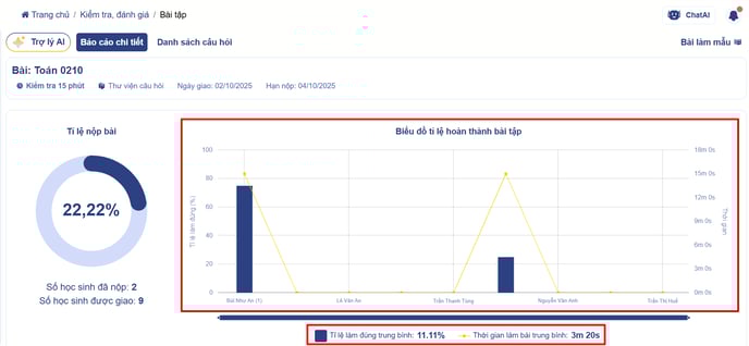 - Bên cạnh đó là biểu đồ tỉ lệ hoàn thành bài tập của từng học sinh. Mỗi cột là một bạn, cột càng cao nghĩa là tỉ lệ làm đúng càng cao. Dưới biểu đồ sẽ có tỉ lệ làm đúng, thời gian trung bình của cả lớp