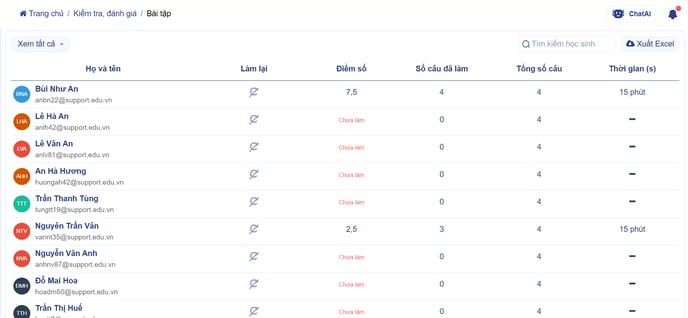 - Bên dưới là danh sách chi tiết của từng học sinh. Thầy cô có thể xem lại bài của học sinh, điểm số, trạng thái đã làm hay chưa làm, số câu đã làm và tổng số câu.