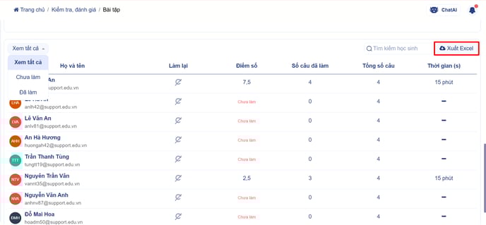 - Thầy cô có thể dùng bộ lọc để xem nhanh nhóm học sinh chưa làm hoặc đã làm bài.
