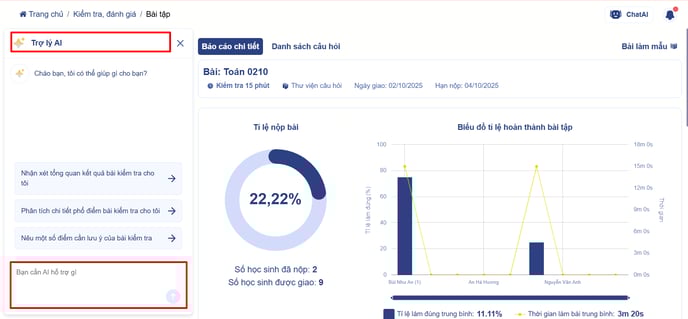 - Ngoài ra, tính năng trợ lý AI, sẽ tiến hành phân tích các biểu đồ và viết nhận xét thành dạng văn bản. Thầy cô chỉ cần lựa chọn câu lệnh mẫu hoặc nhập câu lệnh mình cần vào hệ thống.