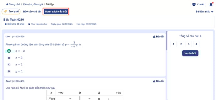 - Tại mục “Danh sách câu hỏi" sẽ hiển thị chi tiết nội dung của bộ đề và thứ tự của câu hỏi tương ứng với biểu đồ tỉ lệ đúng sai ở phần báo cáo chi tiết.