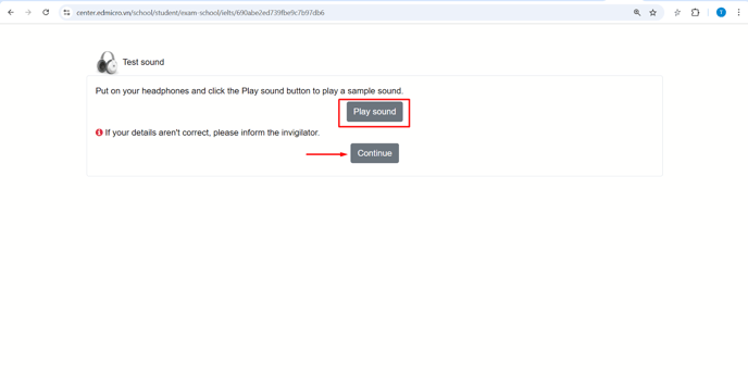 Hệ thống hiển thị màn kiểm tra âm thanh thiết bị, học sinh bấm chọn “Play sound” để kiểm tra xem đã nghe được âm thanh chưa. Sau khi kiểm tra xong, học sinh bấm chọn “Continue” để bắt đầu làm bài