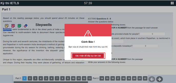 Học sinh lưu ý không thoát màn hình ra khỏi khu vực dự thi, nếu bị bắn cảnh báo, học sinh cần bấm “Xác nhận để tiếp tục làm bài”