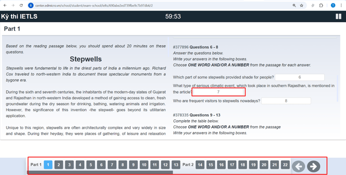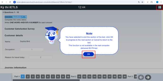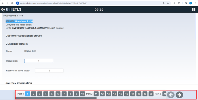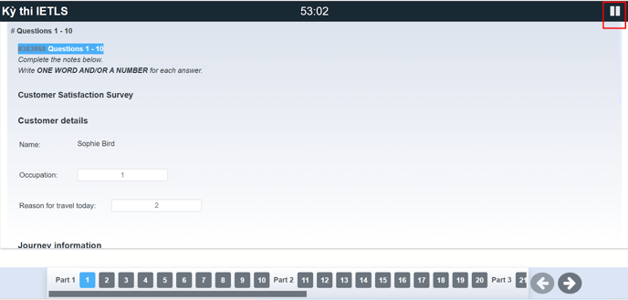 File nghe được phát tự động, học sinh nghe và trả lời lần lượt các câu hỏi theo part tương ứng, học sinh có thể chọn câu theo thanh ngang bên dưới để làm bài