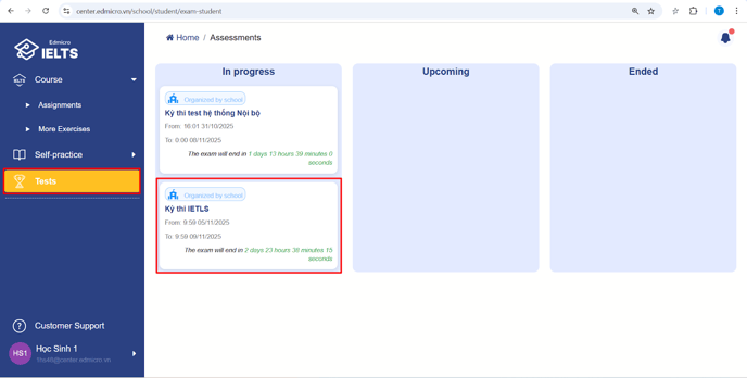 Bước 2: Chọn kỳ thi, học sinh chọn “Tests” sau đó chọn vào kỳ thi đang diễn ra để làm bài