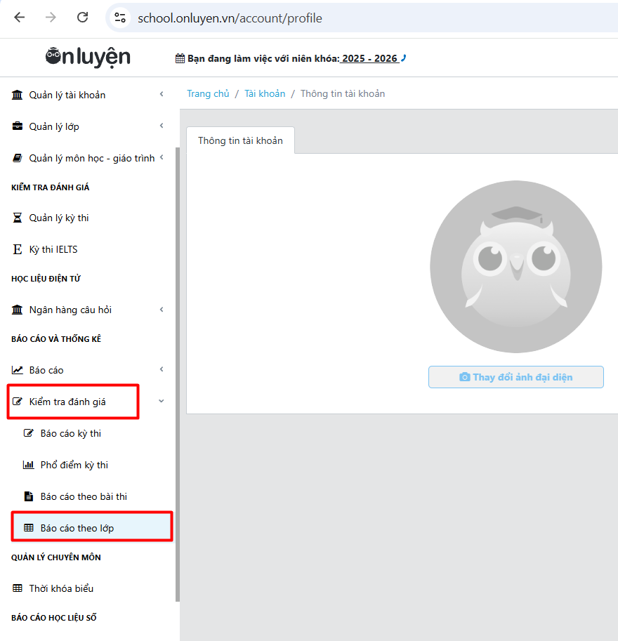 Bước 2: Thầy/cô chọn “Kiểm tra đánh giá” trong mục Báo cáo thống kê, sau đó chọn “Báo cáo theo lớp”