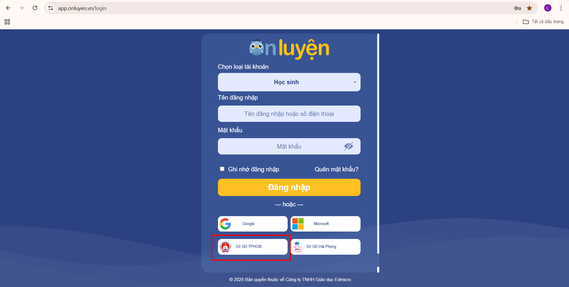 Để đăng nhập ứng dụng Onluyen.vn bằng việc sử dụng tài khoản cơ sở dữ liệu ngành GD TPHCM, học sinh làm theo hướng dẫn sau: