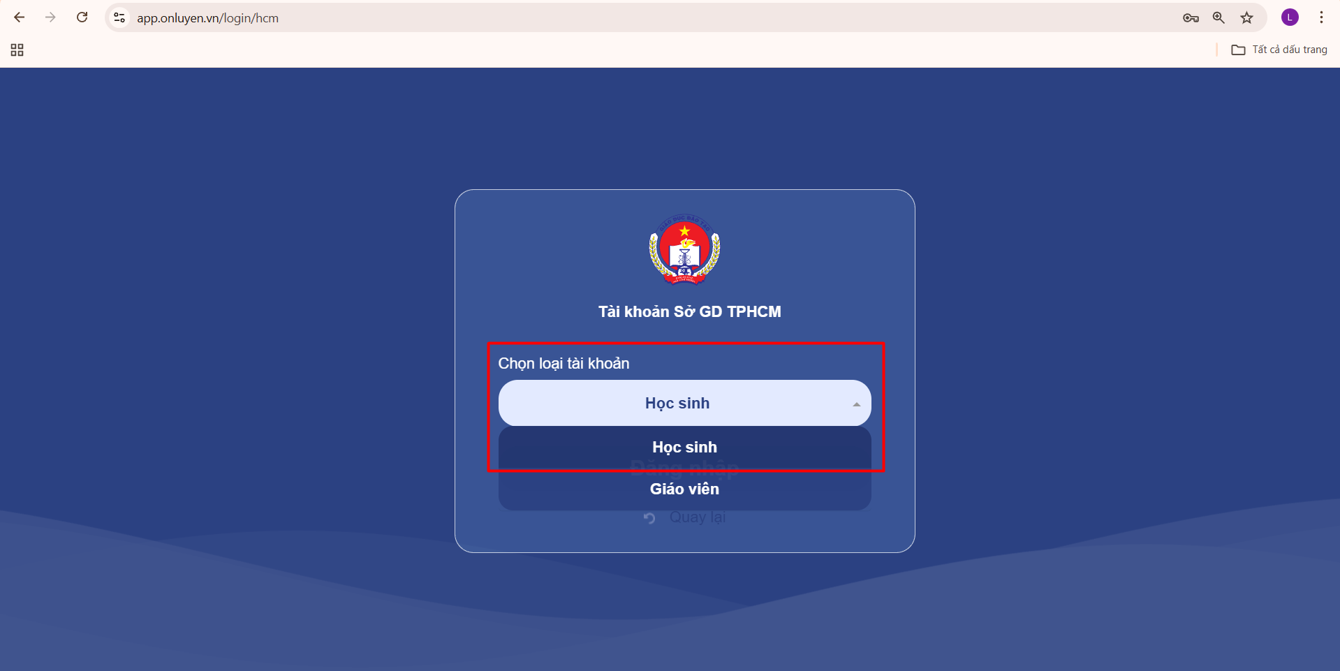 - Tại màn đăng nhập, học sinh chọn mục "Sở GD TPHCM".