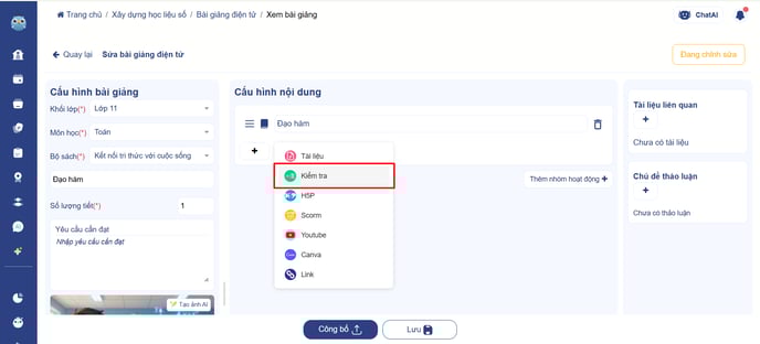 - Thầy/cô chọn bài giảng dạng "Kiểm tra".
