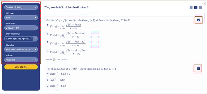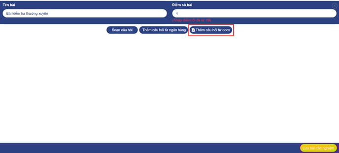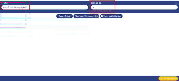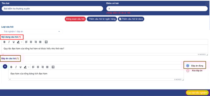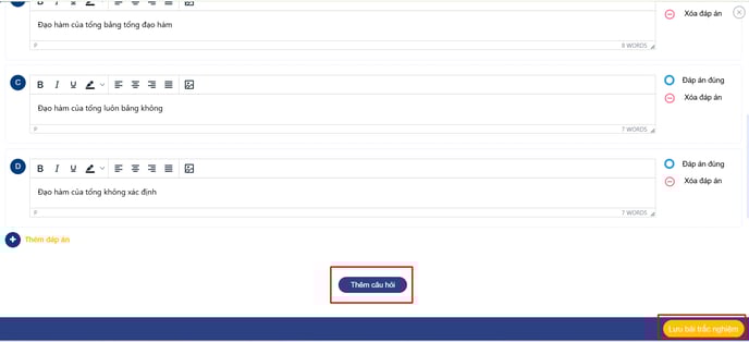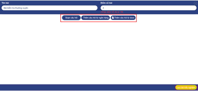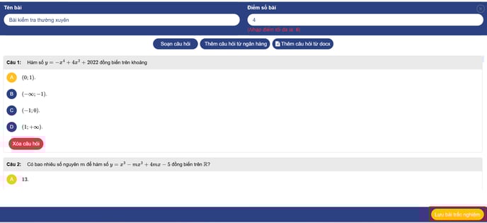 - Sau đó, thầy cô chọn “Thêm câu hỏi” và “Lưu bài trắc nghiệm” để hệ thống tiến hành lưu lại bài thầy cô vừa tạo.
