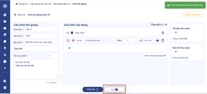 - Hệ thống sẽ hiển thị "Cập nhật nội dung học thành công".