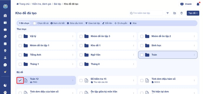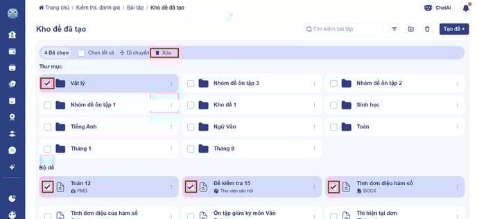 - Nếu muốn xóa nhiều bài tập hoặc thư mục cùng lúc, Thầy/cô chỉ cần tích chọn các mục muốn xóa và ấn vào biểu tượng “Xóa”, sau đó thực hiện bước xác nhận như thông báo để hoàn tất thao tác.