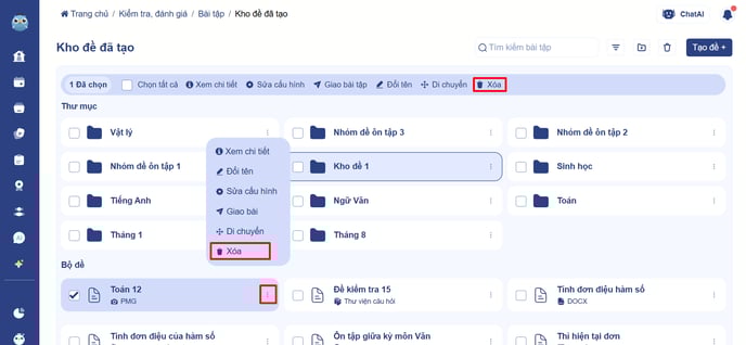 - Thầy/cô tích chọn biểu tượng dấu 3 chấm, chọn nút "Xóa" hoặc nhấn trực tiếp nút xóa trên thanh công cụ