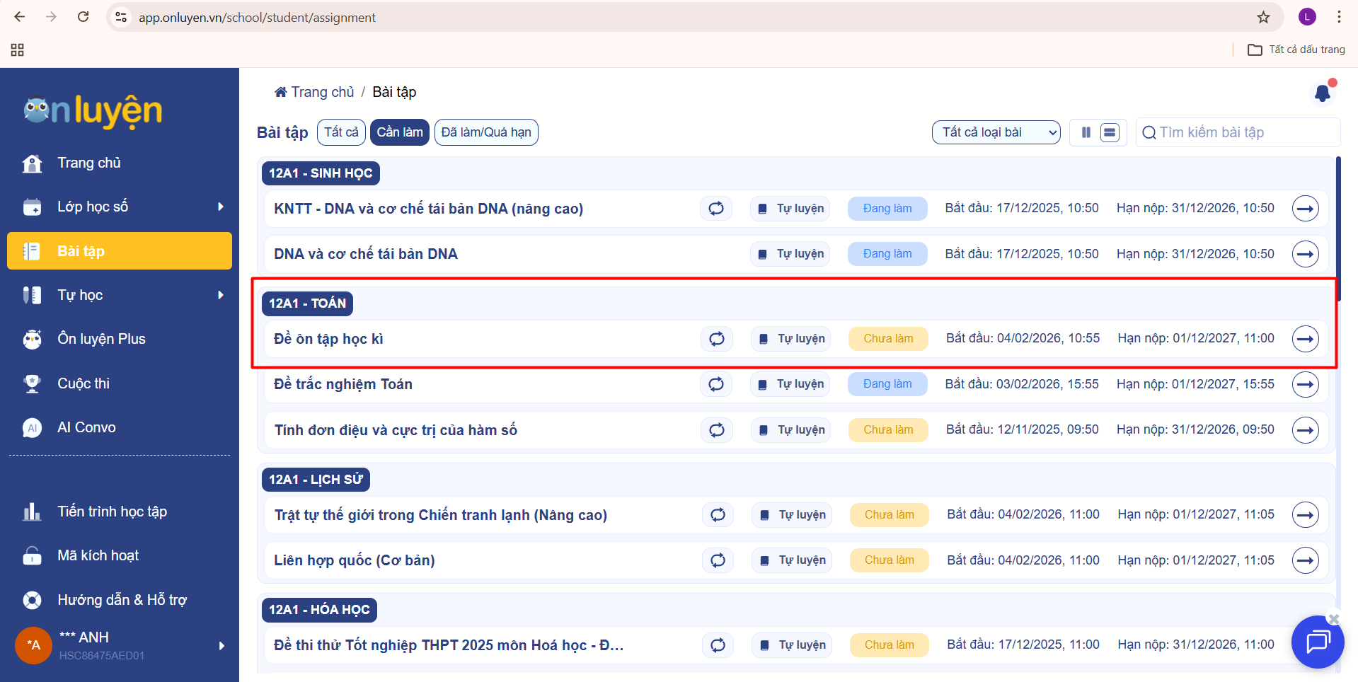 Bước 2: Trên thanh công cụ, học sinh chọn “Bài tập", chọn "Cần làm"