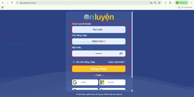 - Tại màn hình đăng nhập, Học sinh vui lòng nhập thông tin tài khoản đã được cung cấp và chọn nút “Đăng nhập” để truy cập vào hệ thống.