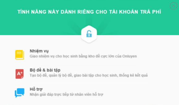 - Khi click vào làm bài hệ thống báo tài khoản chưa có bản quyền: Nguyên nhân là do khi đăng ký tạo tài khoản cho học sinh, nhà trường chủ động tạo thêm 1 số tài khoản mà chưa thông báo về Onluyen để chúng tôi hỗ trợ gán gói. Học sinh báo cáo giáo viên để chúng tôi hỗ trợ gán gói cho học sinh.