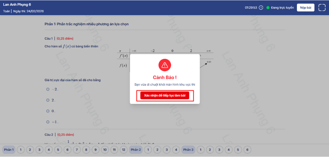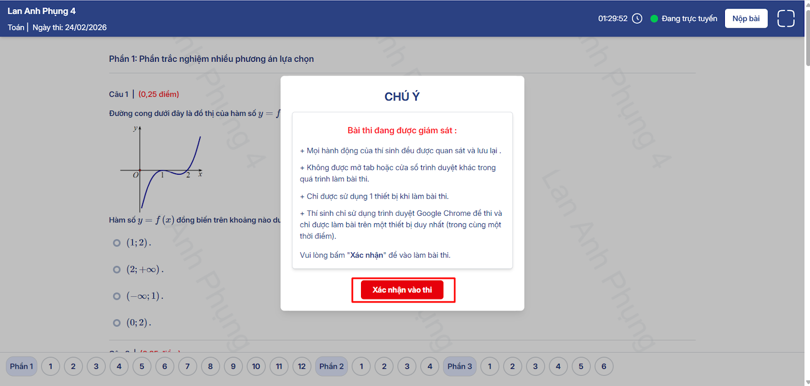 Hệ thống thông báo bật giám sát bài thi, học sinh chọn xác nhận để làm bài