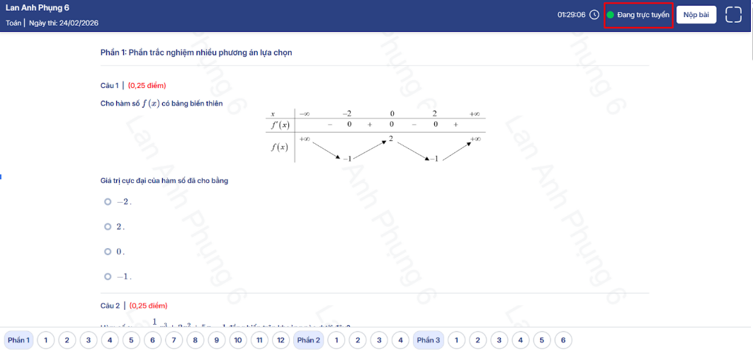 -Học sinh lưu ý trạng thái mạng của thiết bị để đảm bảo lưu lại bài trong quá trình thi, học sinh cần đảm bảo thiết bị đang trực tuyến trong quá trình làm bài thi