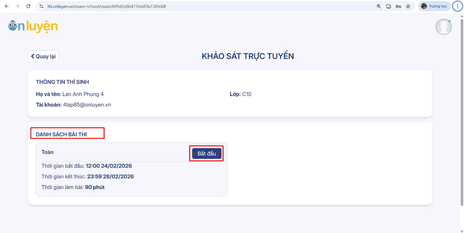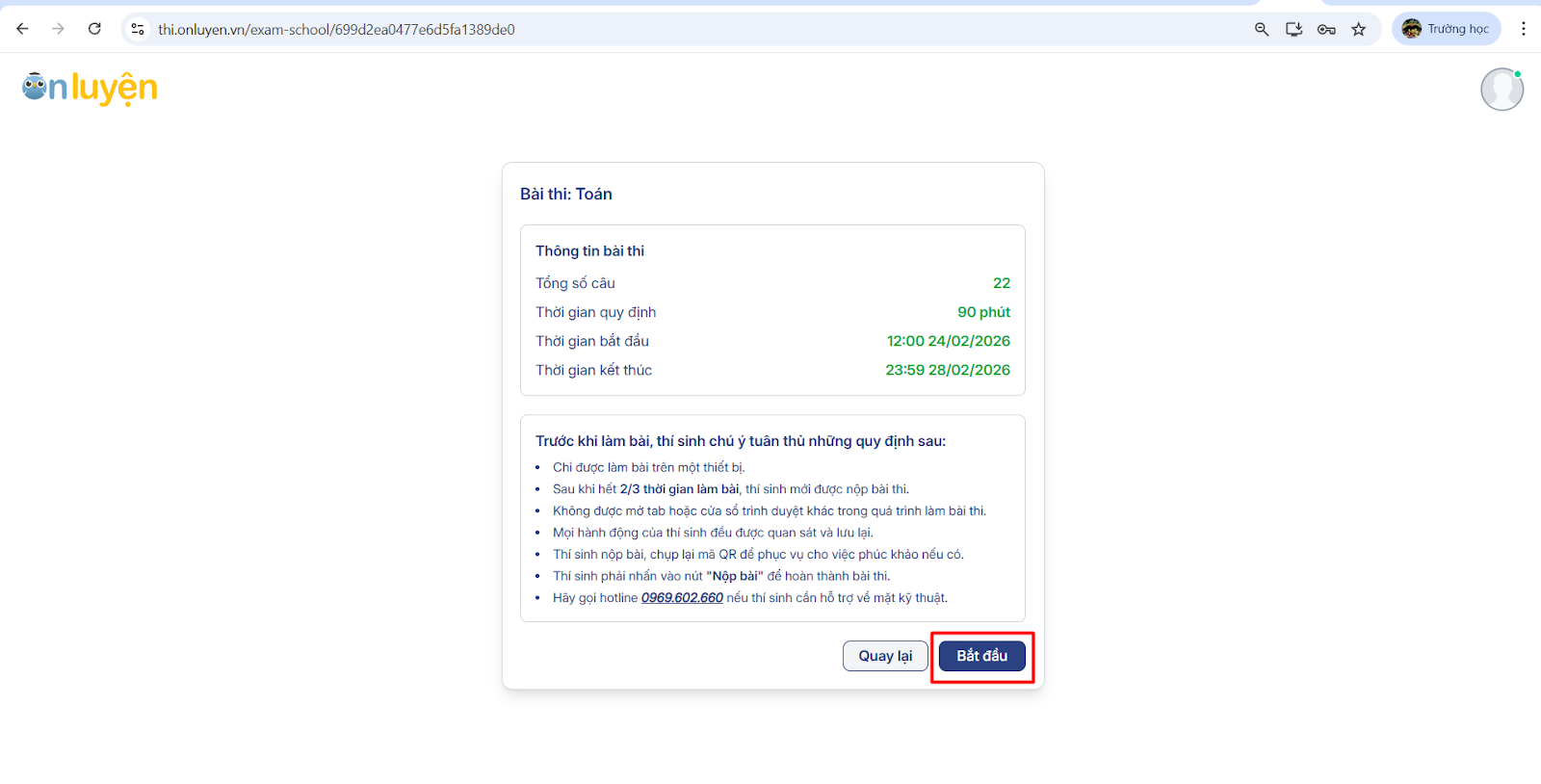 Học sinh chọn “Bắt đầu” để làm bài thi.