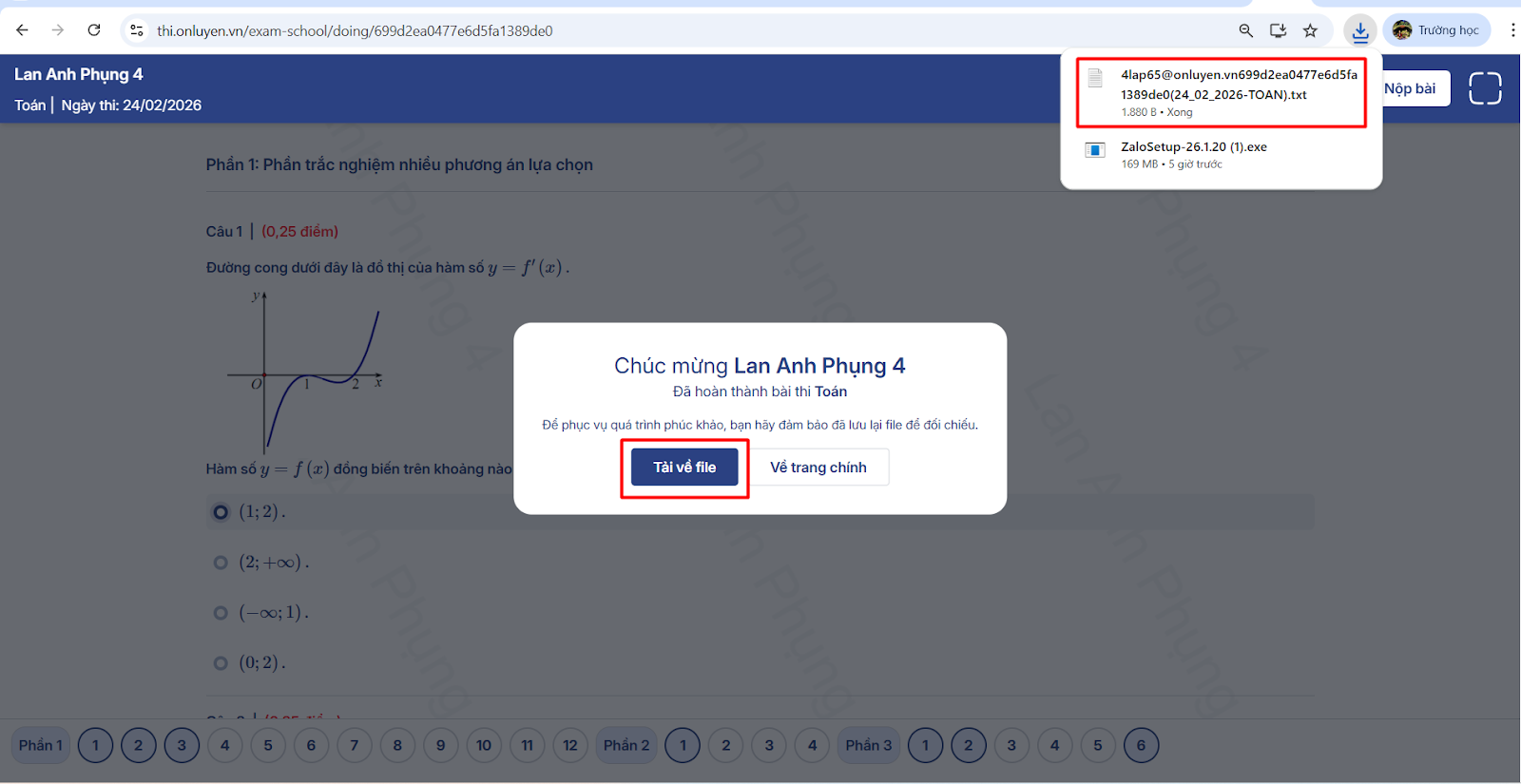 - Đối với đề theo cấu trúc 2025, học sinh lưu mã bài làm về máy. Mã bài làm được lưu dưới dạng file tại mục Tải về trong điện thoại hoặc Downloads trong máy tính, mã bài làm được đặt tên theo cấu trúc Tài khoản_dãy mã_(ngày thi_môn thi)