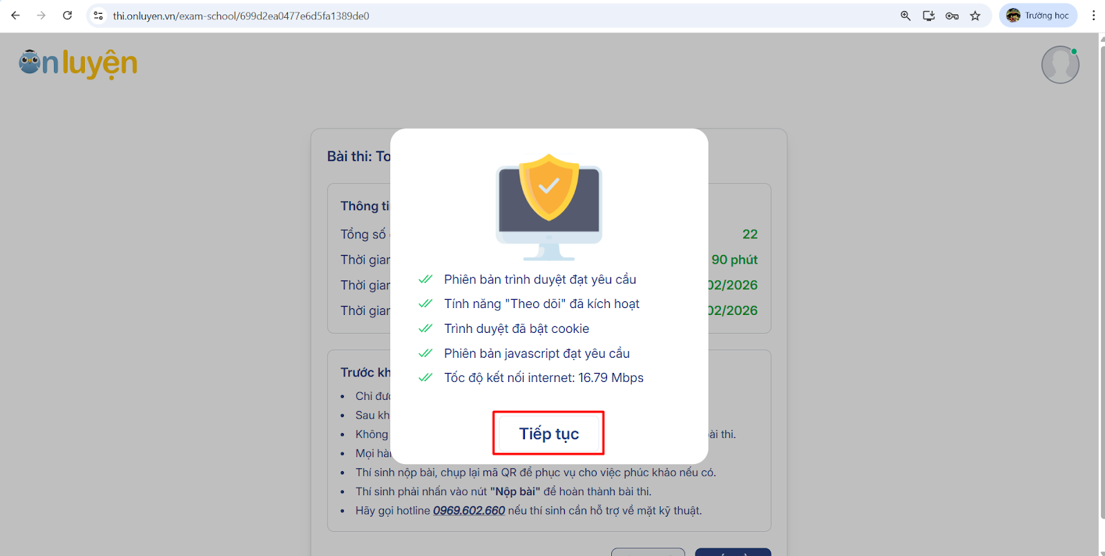 Hệ thống kiểm duyệt thiết bị học sinh đang sử dụng để làm bài thi, học sinh bấm “Tiếp tục” để bắt đầu làm bài