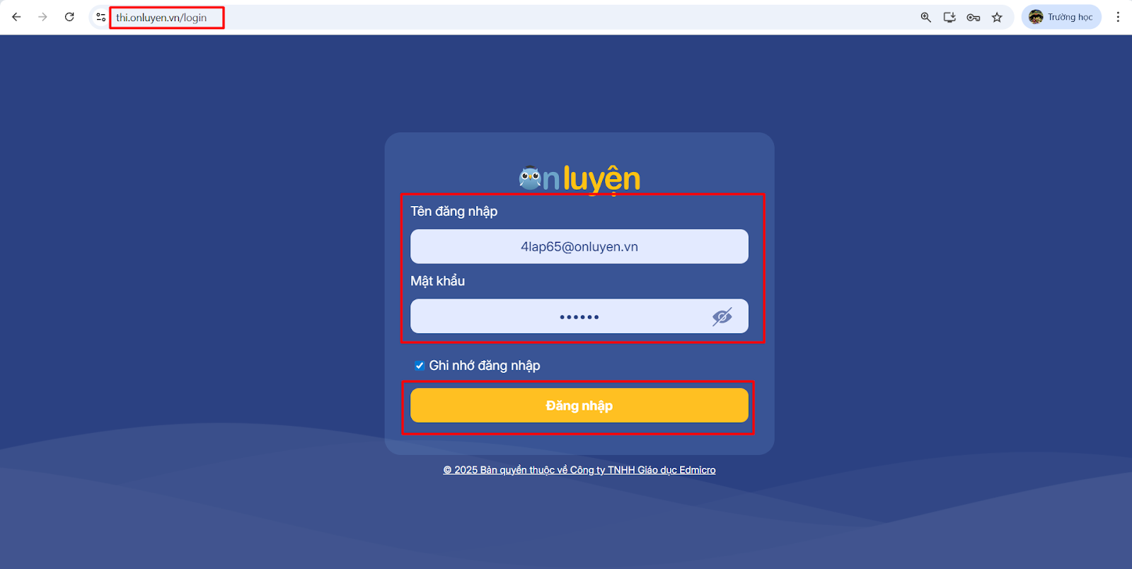- Học sinh sử dụng trình duyệt Google Chrome đăng nhập tài khoản và mật khẩu được cấp trên trang web thi.onluyen.vn.