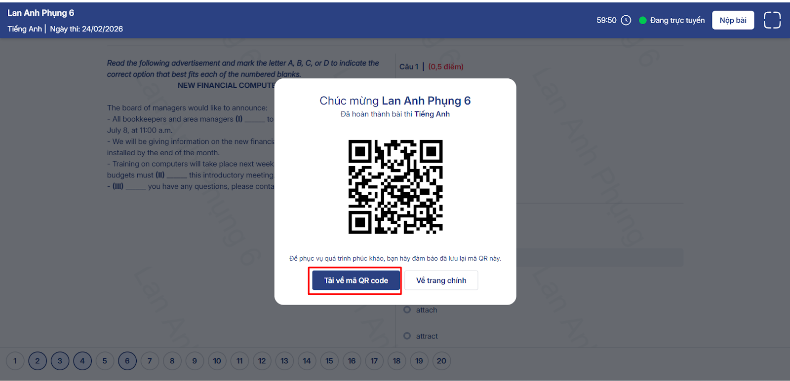 Hệ thống hiển thị mã QR Code hoặc mã bài làm. Học sinh cần lưu mã về máy để phục vụ cho quá trình phúc khảo (nếu cần). Nếu không lưu mã này hệ thống không thể thực hiện quy trình phúc khảo.