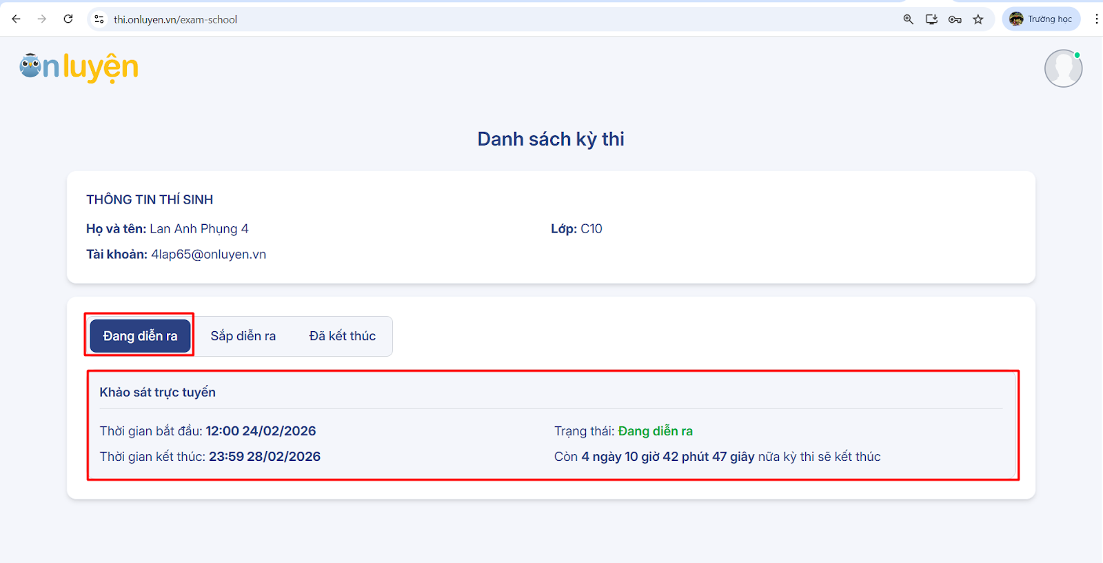Bước 2: Học sinh chọn mục “Đang diễn ra” và chọn kỳ thi đang diễn ra để tham gia thi