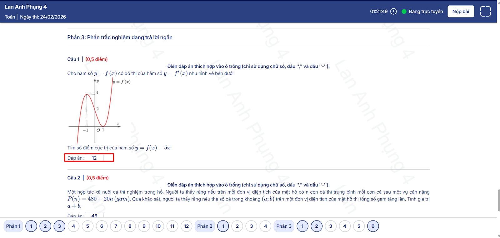 Đối với câu hỏi trả lời ngắn: Học sinh nhập đáp án của mình tại ô đáp án