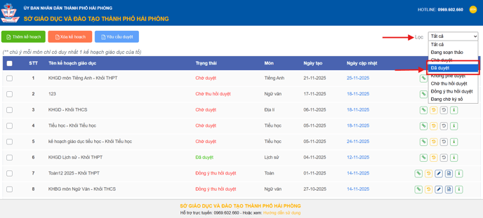 - Thầy/cô chọn bộ lọc, tìm trạng thái "Đã duyệt''