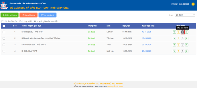 - Sau khi kế hoạch giáo dục của tổ chuyên môn được duyệt bởi Ban giám hiệu, để chỉnh sửa kế hoạch giáo dục nhưng không thay đổi phân phối chương trình của tổ bộ môn, Giáo viên Trưởng bộ môn cần xin thu hồi duyệt để được chỉnh sửa và cập nhật.