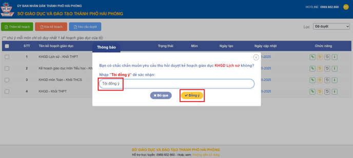 Lưu ý: Thầy/cô thông báo với Ban giám hiệu thao tác Đồng ý thu hồi duyệt. Sau khi Ban giám hiệu đồng ý thu hồi, giáo viên Trưởng bộ môn có thể chỉnh sửa tệp kế hoạch giáo dục mà không cần thay đổi phân phối chương trình đã tải lên của tổ bộ môn.