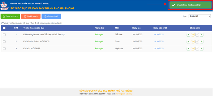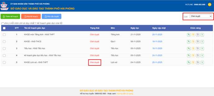 - Lúc này, KHGD đó sẽ chuyển sang trạng thái "Chờ duyệt", BGH sẽ nhận được KHGD này và duyệt lại
