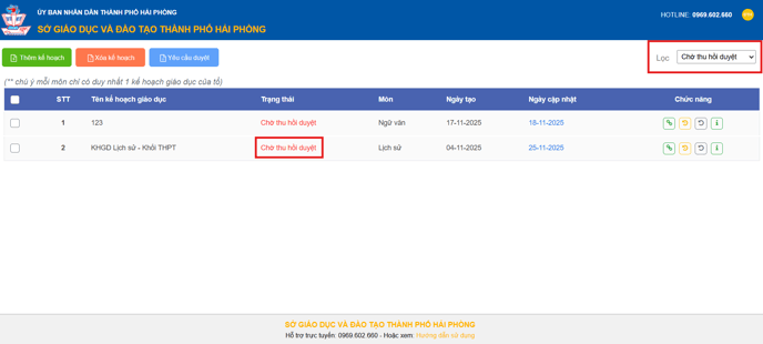 - Thầy/cô chọn bộ lọc trạng thái "Chờ thu hồi duyệt"