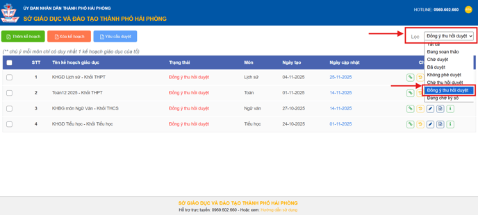 - Thầy/cô chọn bộ lọc, tìm trạng thái "Đồng ý thu hồi duyệt".