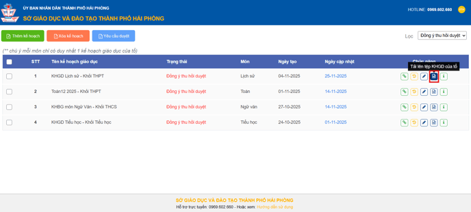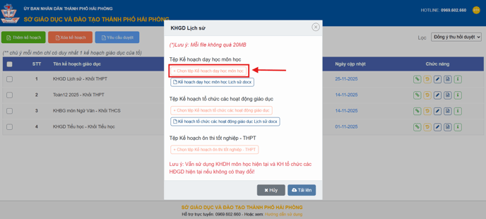 - Tại dòng kế hoạch cần chỉnh sửa, Thầy/cô bấm vào biểu tượng tải lên tệp KHGD của tổ