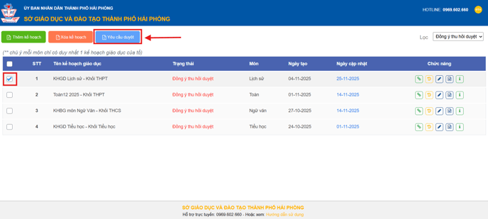 - Tại màn hình Danh sách các kế hoạch giáo dục của tổ, Thầy/cô chọn kế hoạch muốn gửi duyệt lại bằng cách tích vào ô vuông bên trái
