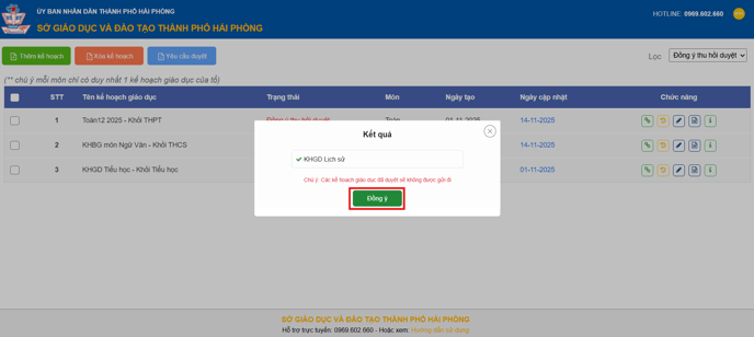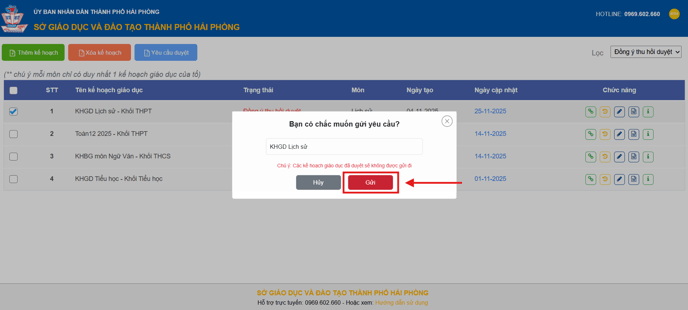 - Hệ thống sẽ hiển thị một thông báo xác nhận. Thầy/cô kiểm tra lại tên kế hoạch, sau đó nhấn "Gửi"