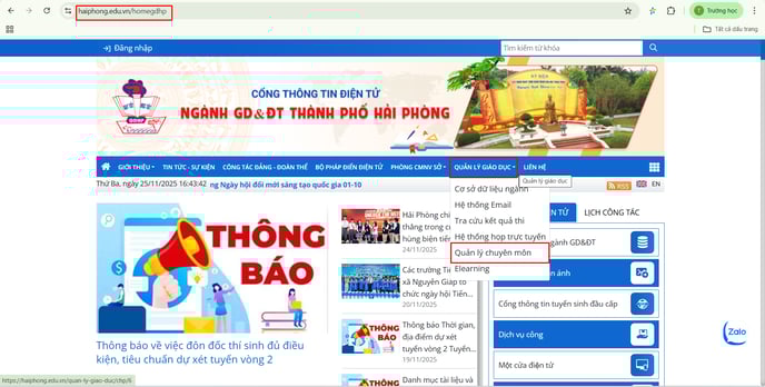 - Tại Cổng thông tin điện tử, Thầy/Cô chọn QUẢN LÝ GIÁO DỤC, chọn QUẢN LÝ CHUYÊN MÔN.