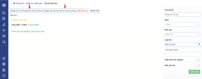 Thầy/cô tải file đề word lên trong mục : " Nhập câu hỏi thường từ Word ( docx)" đối với đề trắc nghiệm, " Nhập câu hỏi học liệu từ Word ( docx)" đối với đề tự luận hoặc học liệu.