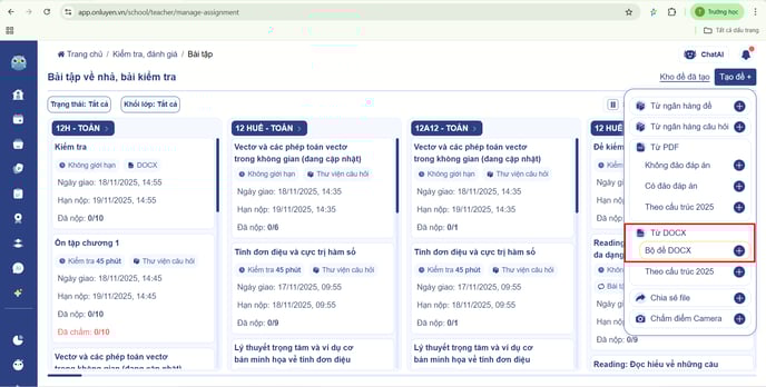 Bước 3: Thầy/cô chọn “Tạo đề”, sau đó chọn "Bộ đề docx"